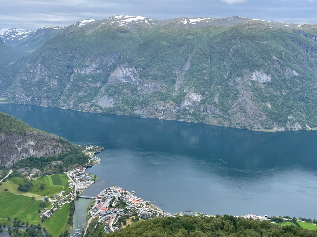 Today we drove along and up Aurlandsfjord to Stegastein, an observation area overlooking the fjord. It did not disappoint! The town in the foreground is Aurdal; our hotel is on the right side of the peninsula.